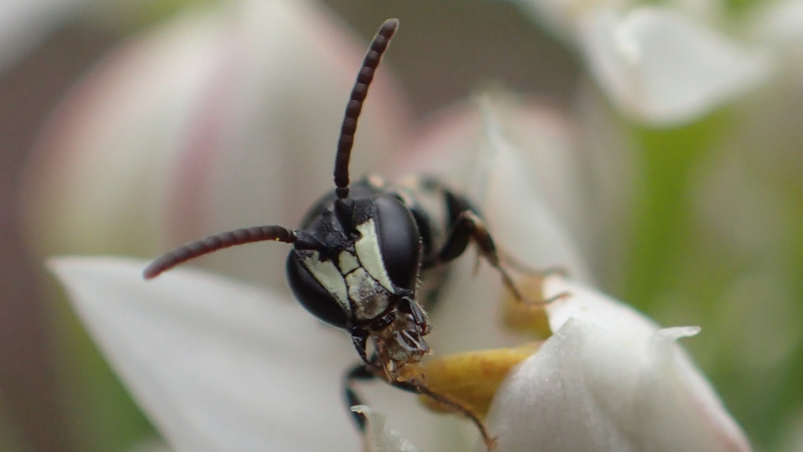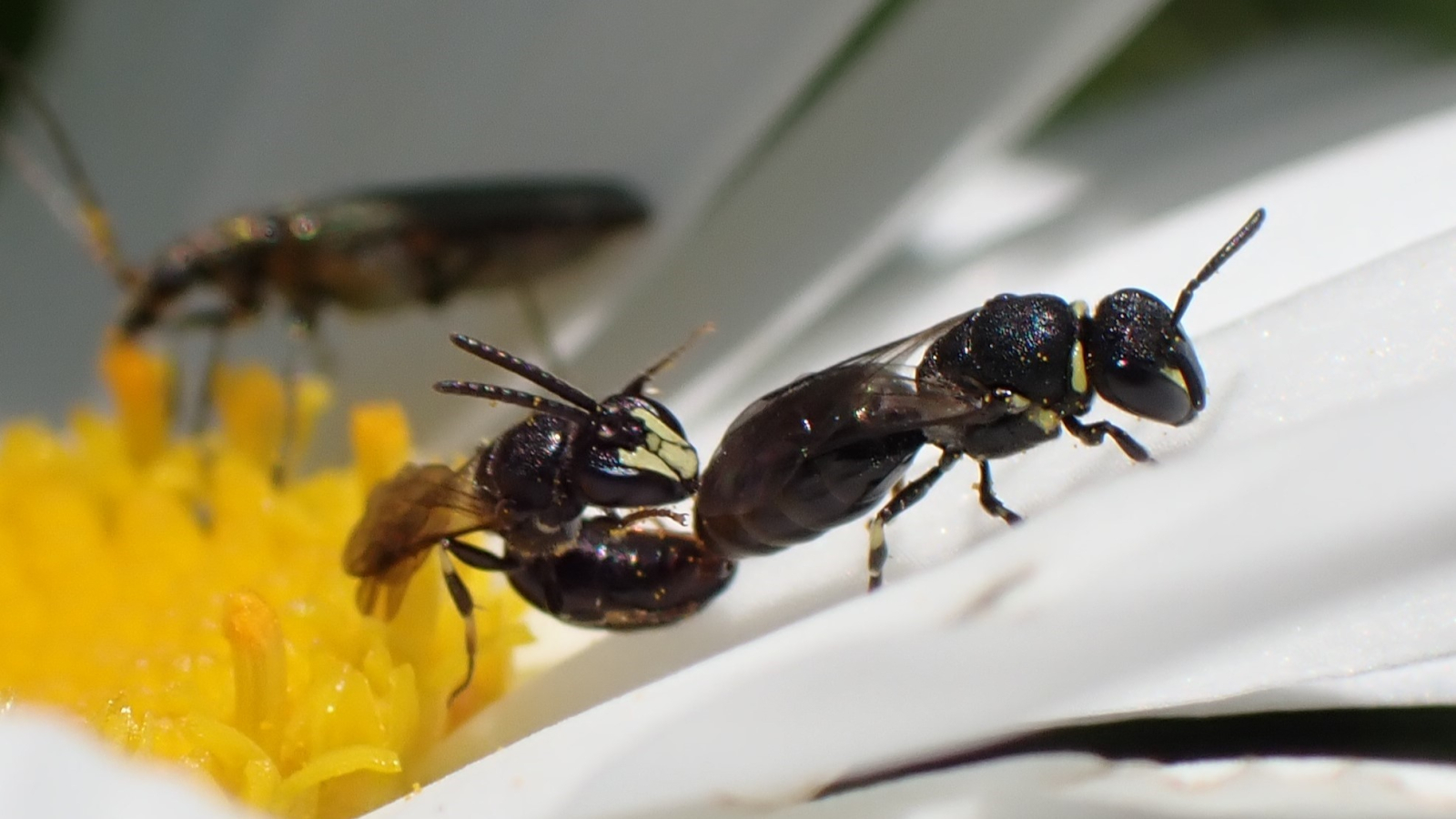 Maskerbijtjes zijn zwart en bijna kaal. Soms lijken ze een beetje op mieren. Maar in tegenstelling tot mieren hebben ze een prachtig wit maskertje op het gezicht, en gele vlekjes op hun poten. Goed kijken, want ze zijn heel klein!
